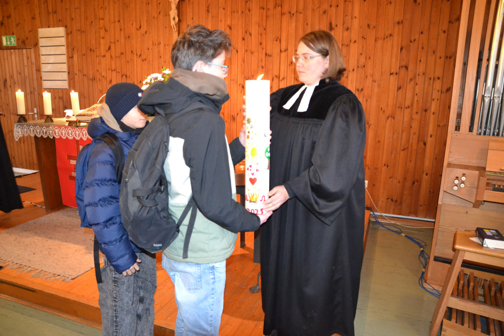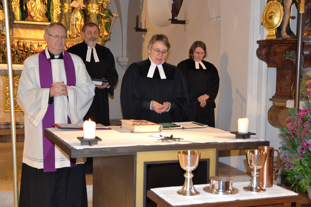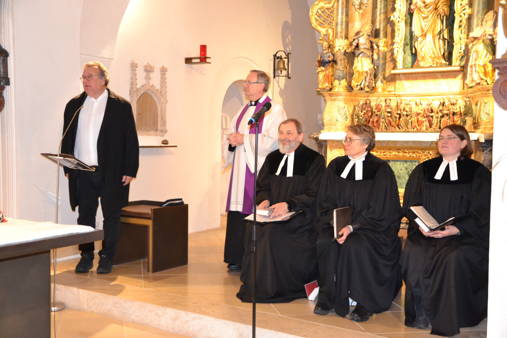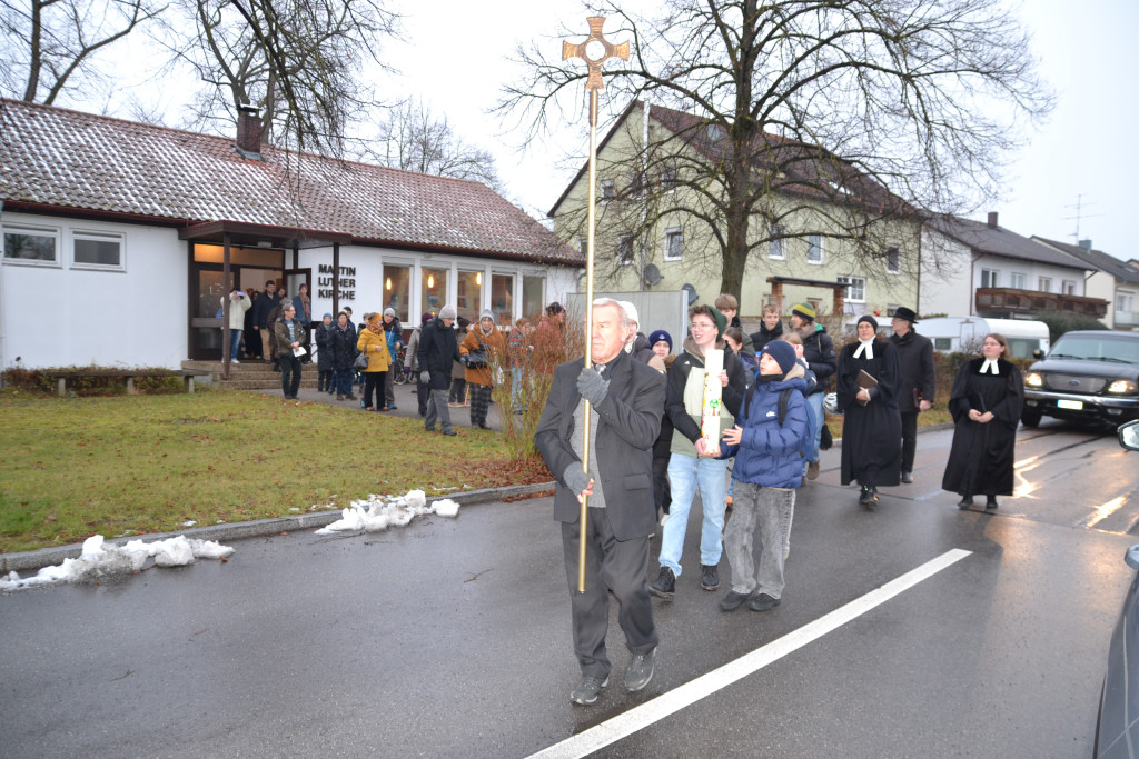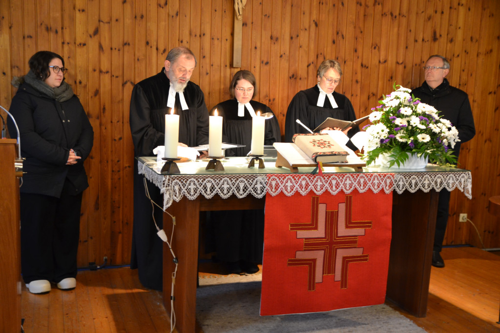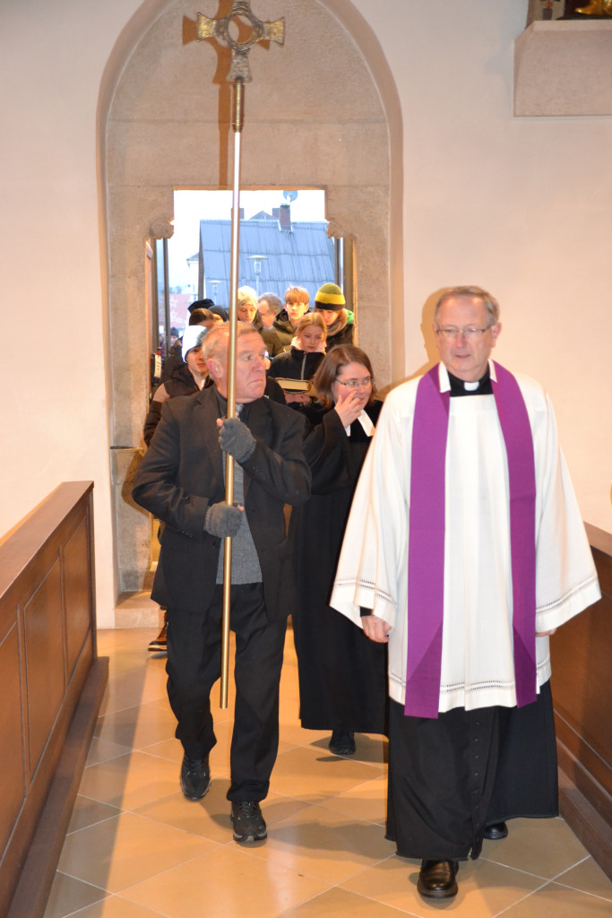 Am 29. November wurde die Martin-Luther-Kirche in Tegernheim nach 57 Jahren feierlich entwidmet. Bereits ab 14 Uhr war die Kirche geöffnet, um Raum für Abschied, Begegnung und Erinnerungen zu geben. Bei Punsch und Gebäck konnten Besucher alte Zeitungsartikel und Fotos betrachten, die das lebendige Gemeindeleben der vergangenen Jahrzehnte dokumentierten. Um 15 Uhr begann der Entwidmungsgottesdienst, geleitet von Klaus Stiegler, den Pfarrerinnen Julia Funke und Sibylle Thürmel, Pfarrer Chamrád, Religionspädagogin Annika Tischendorf sowie dem katholischen Pfarrer Kuniszewski. Dekan Jörg Breu war ebenso unter den rund 65 Personen, die die Kirche ein letztes Mal mit Gebet und Gesang füllten. Im Anschluss zog die Gemeinde gemeinsam mit Kreuz, Bibel, Abendmahlsgerät und Taufkanne zur katholischen Kirche Mariä Verkündigung. Dort wurde ein ökumenischer Wortgottesdienst gefeiert – Auftakt für den „ökumenischen Weg“, der nun beginnt. Ab dem Advent finden im katholischen Pfarrheim alle zwei Wochen evangelische Gottesdienste statt. Weitere ökumenische Aktivitäten sind geplant, denn: Evangelisches Leben hört in Tegernheim nicht auf. (Artikel Anke Polednik) Pfrin. Funke hat ein Gästebuch aufgelegt, in das die Anwesenden ihre Erlebnisse der letzten Jahre und Jahrzehnte festhalten konnten. Im nächsten Lukas Aktuell sollen nochmals 4 Erinnerungsseiten gedruckt werden. Bitte schreiben Sie ihre Erinnerungen auf und leiten sie bis 15. Januar an Pfarrerin Sibylle Thürmel.